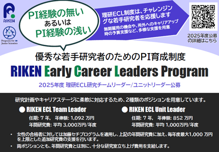 2018年から13人の若手PI(Principal Investigator)を採用してきた理研白眉制度は、優秀な若手研究者の育成に重要な役割を担ってきました。理化学研究所は、若手研究者に対してより手厚い支援を行うため、理研白眉制度を拡充し、新しい理研ECL制度(RIKEN Early Career Leaders Program)を創設しました。