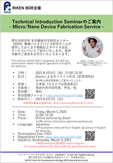 This is a seminar introducing "Micro/Nano Device Fabrication Service" provided by Laboratory for Integrated Biodevice at RIKEN Center for Biosystems Dynamics Research (BDR). The seminar will be held in Japanese, but will use presentation slides in English. Questions in English are welcome.