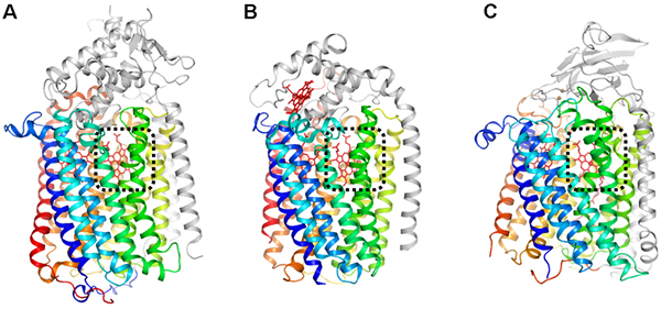 Comparison of the overall structures of the respiration enzymes: (A) qNOR, (B) cNOR, and (C) COX. These enzymes share similar structure of the core region shown with rainbow color. Each catalytic site denoted by black dotted line contains heme molecule shown as a red stick.