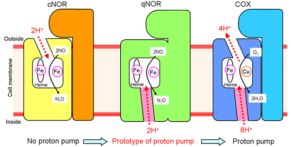 With their latest research, the team sought an answer to this mystery in the origin of an evolutionary innovation known as the "proton pump". To accelerate ATP-synthesis, aerobic organisms harness the potential of an electrochemical concentration gradient across the cell, created by "pumping" protons out using energy from an oxygen reduction reaction. The enzyme powering this mechanism, cytochrome oxidase (COX), is genetically and structurally similar to NOR, suggesting a common ancestor. No evidence of any "pump", however, has been detected in anaerobic organisms.