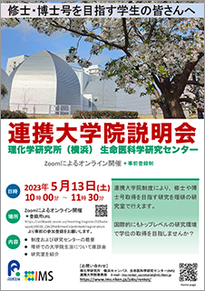 | 応募方法 | ご参加を希望される方は、RIKEN IMS 連携大学院説明会 登録フォームよりご応募ください。(終了しました)