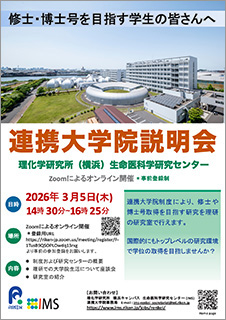 | お問い合わせ | 理化学研究所 生命医科学研究センター(IMS) 連携大学院事務局 Email: ims-renkei_secretariat@ml.riken.jp |