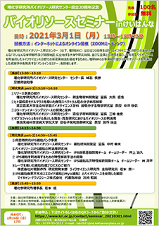理研バイオリソース研究センター(BRC)は今年設立20周年を迎えます。そのイベントの一環として、2021年3月1日(月)にBRCの事業紹介並びにバイオリソースを利活用した成果事例を発表する「オンラインセミナー」を開催します。