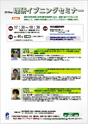 | 参加申し込み |  参加ご希望の方は、会社名、氏名、メールアドレス、電話番号、希望する回(複数可)を記載の上、件名を『理研イブニングセミナー参加申込』として、下記のメールアドレスあてにお申し込み下さい。 Email: evening-seminar[at]riken.jp ※[at]は@に置き換えてください。  |