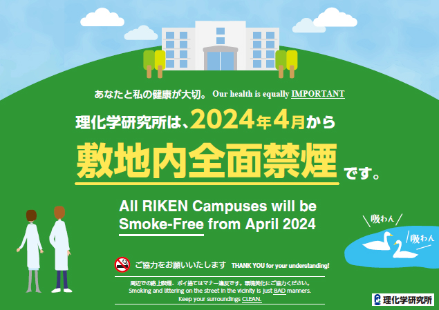 このため、当研究所は、2024年4月から敷地内全面禁煙を実施することを宣言しますので、当研究所に関わる全ての人々の一層の健康増進のため皆様のご理解、ご協力をお願いいたします。