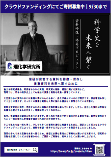 - 概要:理研では論文や研究成果品、研究者ゆかりの資料、研究所の特許、運営に関する資料など、日本の科学史上とても有益で貴重な資料を収集・保管しています。大正期からの資料の中には脆弱な素材のものも多く、劣化が進んでいるのが現状です。また保存環境も決して十分とは言えず、貴重な資料も、人目に触れる機会なく静かに保管されている状態です。理研の歩んできた足跡を未来へ繋ぐため、資料の保存・修復に必要な費用の獲得を目指し、クラウドファンディングに挑戦します。